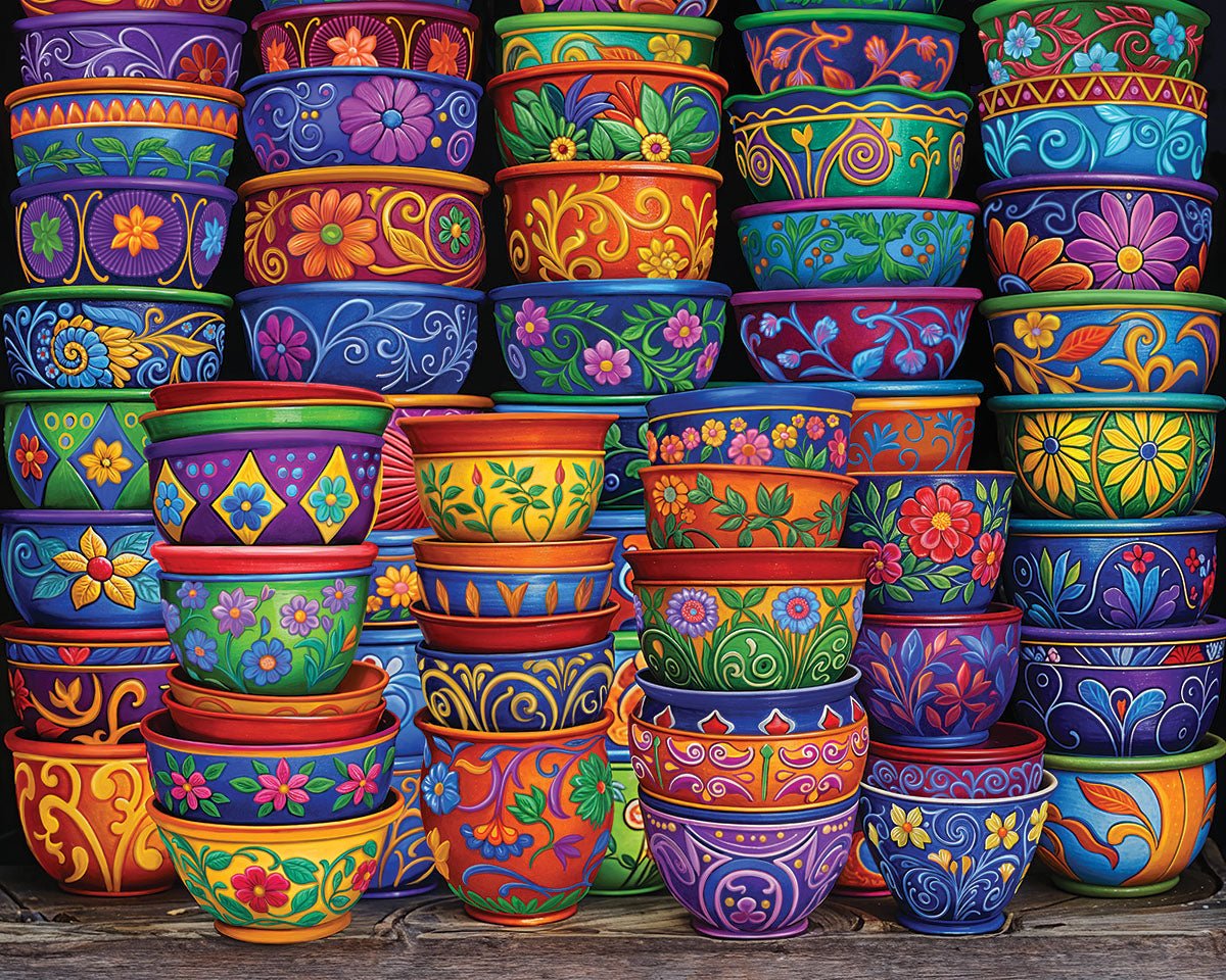 1996 Bowled Over. Vibrant blues, purples, greens, yellows, and reds combine to create intricate details and patterns that are not only beautiful to look at but fun to assemble in this 500 piece jigsaw puzzle. Finished size of 18” x 24”.