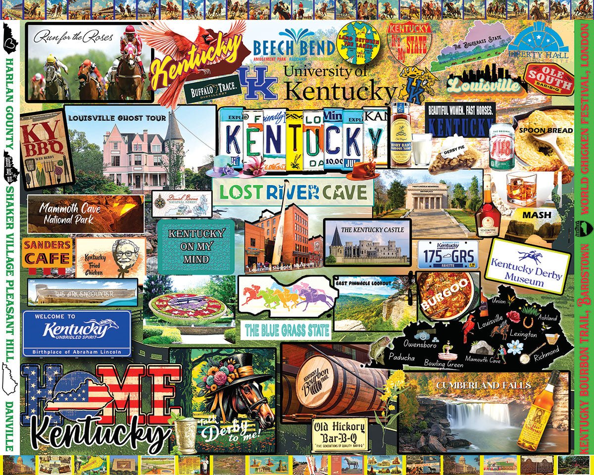 2011pz I Love Kentucky. Famous for its bourbon whiskey, horse racing, bluegrass music and more. Designer Lois B Sutton collected places, symbols, and events that make Kentucky a state that tourists flock to in increasing numbers year over year.1,000 piece collage style jigsaw puzzle. Finished size of 24” x 30”.