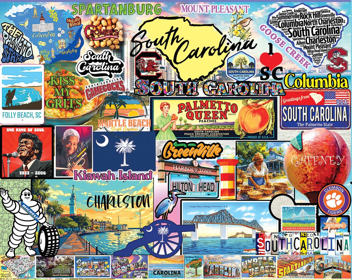 2010 I Love South Carolina. Referred to as the palmetto state, South Carolina offers a warm climate, beautiful beaches and an abundance of historical attractions that draw people from all around the globe. Designer Lois B Sutton gathered places and symbols that are famous in South Carolina in this 1,000 piece collage style jigsaw puzzle. Finished size of 24” x 30”.