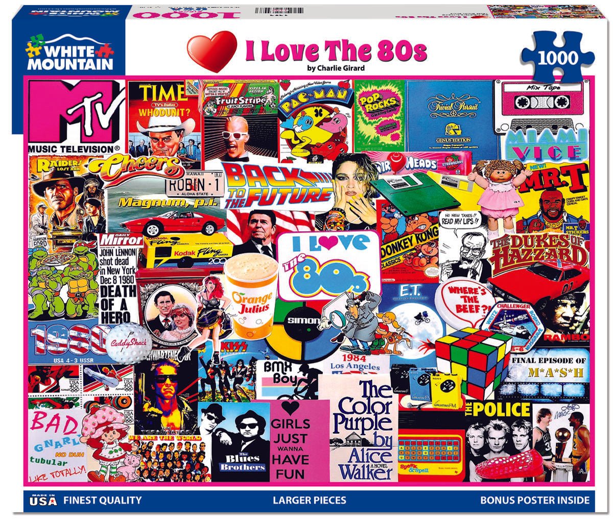Full of fun, pop culture images from the 1980's, has organized this trip back in time on a 1,000 piece puzzle with a finished size of 24” x 30”.