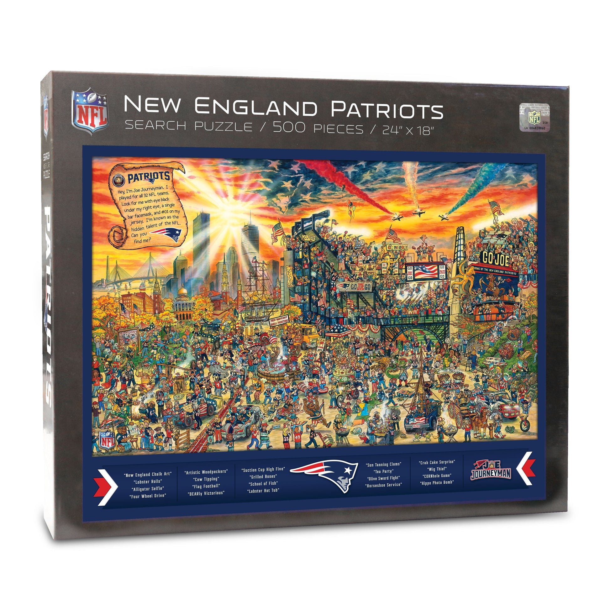 First you have to put the New England Patriots puzzle together. Then you have to find Joe Journeyman - the only player to play for all 32 NFL teams - and discover dozens of laugh-out-loud scenes in these hand-drawn illustrations of NFL stadiums, their fans and their landmark surroundings. The Patriots seek and find adventure puzzle is officially licensed by the NFL for use by Joe Journeyman, a YouTheFan brand.