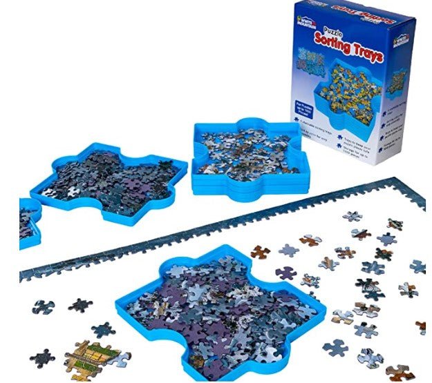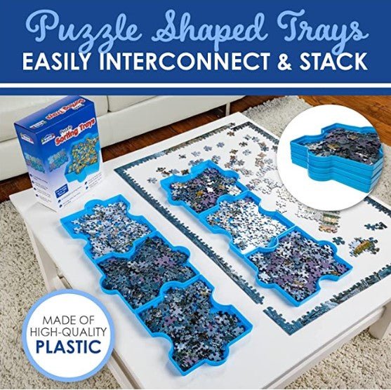 This Puzzle Sorting Trays is a brand new item for the dedicated puzzler to organize puzzle pieces by color or whatever your system is. The sorting trays includes six sturdy plastic trays shaped as puzzle pieces that nest into one another for easy stacking and puzzle piece storage, keeping your pieces sorted and your work area neat and safe from losing stray pieces.