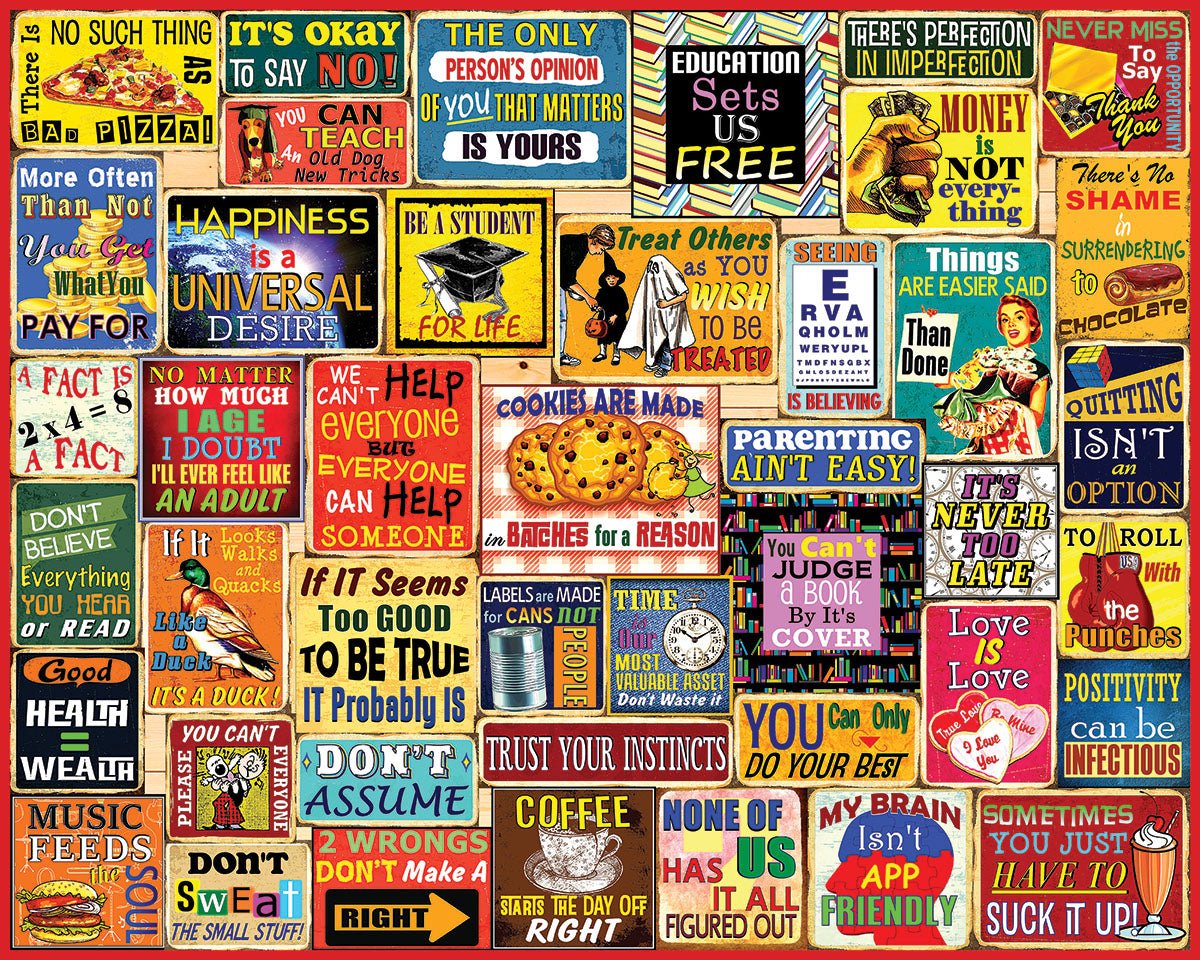 2062 Things I Have Learned. Common phrases, moral laws, concepts, ideas, and thoughts, ranging from motivational to philosophical can be found in this 1000 piece collage style jigsaw puzzle created by Steve Cameron. Finished size 24" x 30".